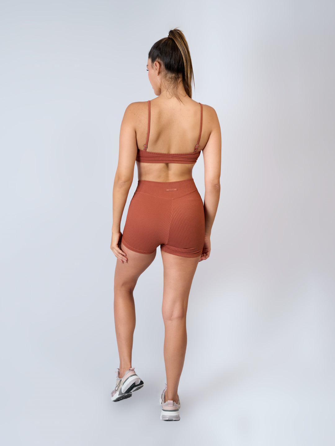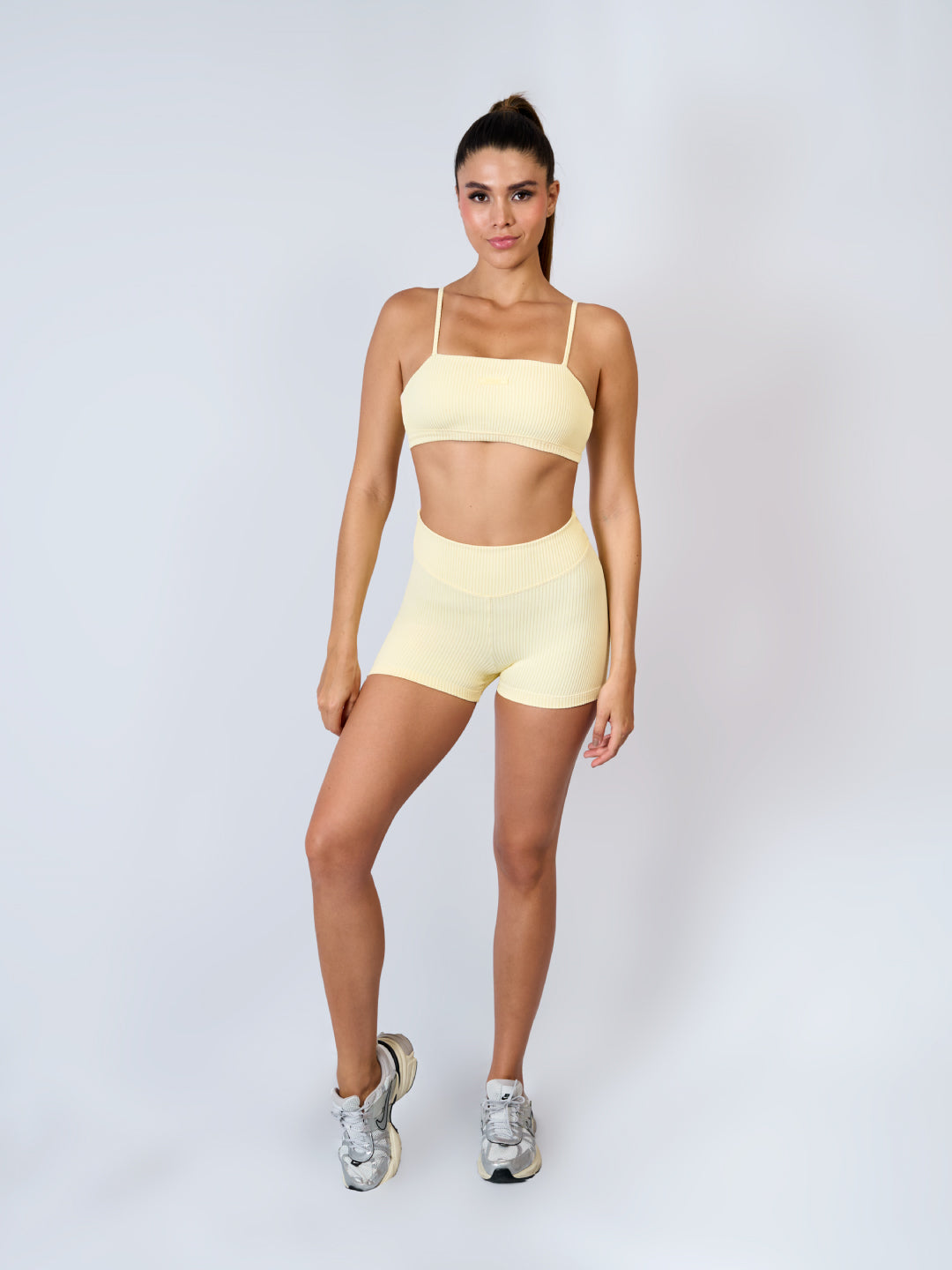The Appearance Ribbed Bra Top features a straight neckline with adjustable straps, crafted from a textured fabric blend of 86% polyamide and 14% elastane for optimal stretch and support. Its design ensures a comfortable fit while maintaining a stylish, versatile look, making it an excellent choice for layering or wearing on its own.