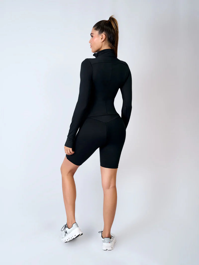 This long-sleeved semi-fitted jacket features a high collar and a secure front closure, blending modern style with versatile functionality. Crafted from a durable blend of 67% nylon and 33% spandex, it offers a comfortable fit with added stretch for ease of movement. Ideal for layering, this jacket combines performance and contemporary design to seamlessly complement your active wardrobe.